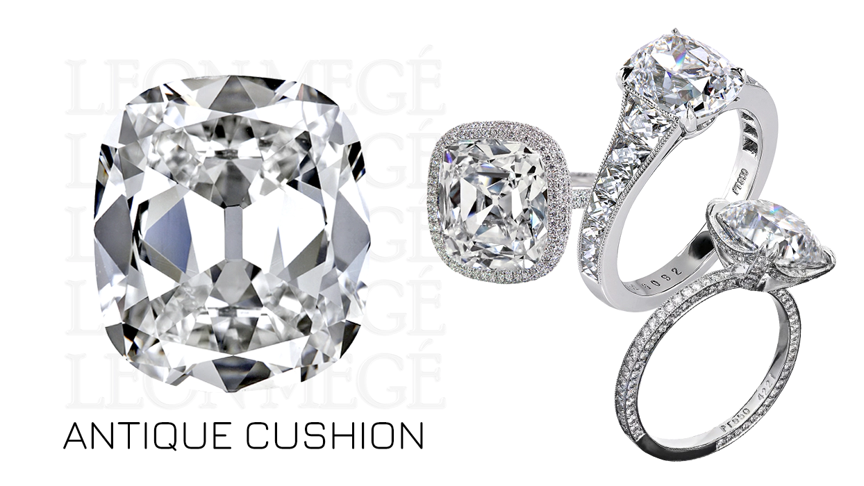 An Antique cushion-cut diamond is a classic and timeless jewel. Its pillow-shaped outline, softly rounded corners, small table, high crown, and large open culet easily distinguish it from other diamond cuts. No other diamond cut can replicate the Antique Cushion’s prized mix of checkered brilliance and extreme dispersion. Antique cushions are extremely rare.