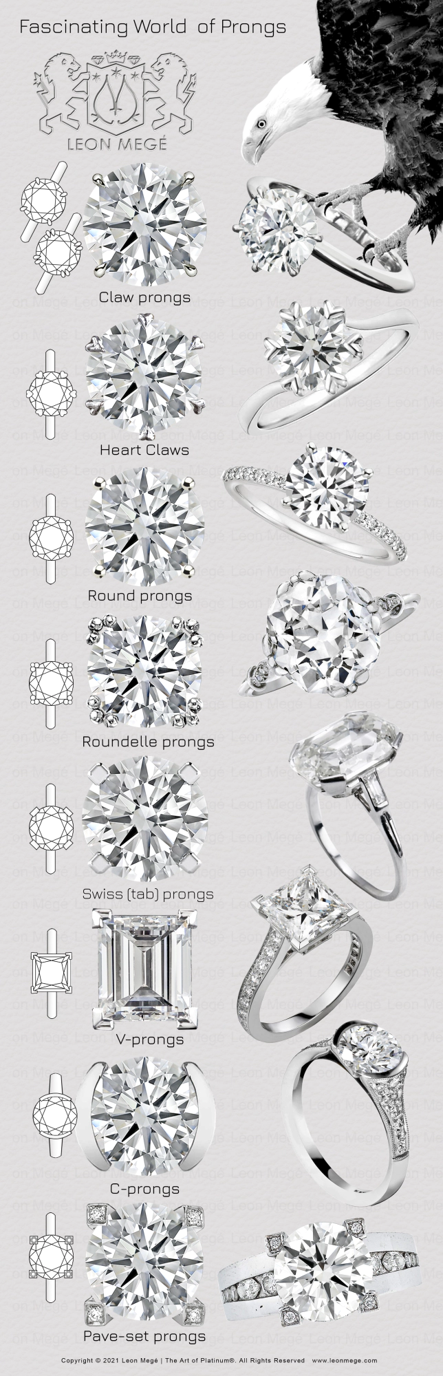 Claw prongs are shaped like pointy talons. The claw shape makes them nearly invisible. Unlike round prongs, shaped with a rotary tool, the claw prongs are painstakingly finished by hand using files and grinding wheels. Filing requires a lot of experience and takes time. It is physically impossible to maintain a consistent shape during mass production. It takes a lot of experience and know-how to finish a perfect “eagle-claw” prong. Much of the appeal of Leon Mege jewelry is in the ideal shape of our eagle-claw prongs